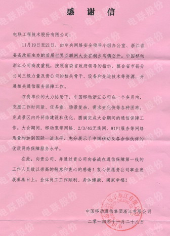 After WIC, the employer sent a thanks letter to acknowledge DY-Link’s superior service level of network construction and security as below: With your strongly support, CMCC Zhejiang Branch Office overcame difficulties of limited working hours, heavy tasks, complicated environment and changing demands to complete the network construction and optimization at the scenic spot of internal and external, thus successfully finished the communication security task for WIC. During the conference, the quality of the mobile broadband network, 2/3/4G wireless network and WIFI service reached international first-class level, fully demonstrated the high network security service level of CMCC as well as the partners.
