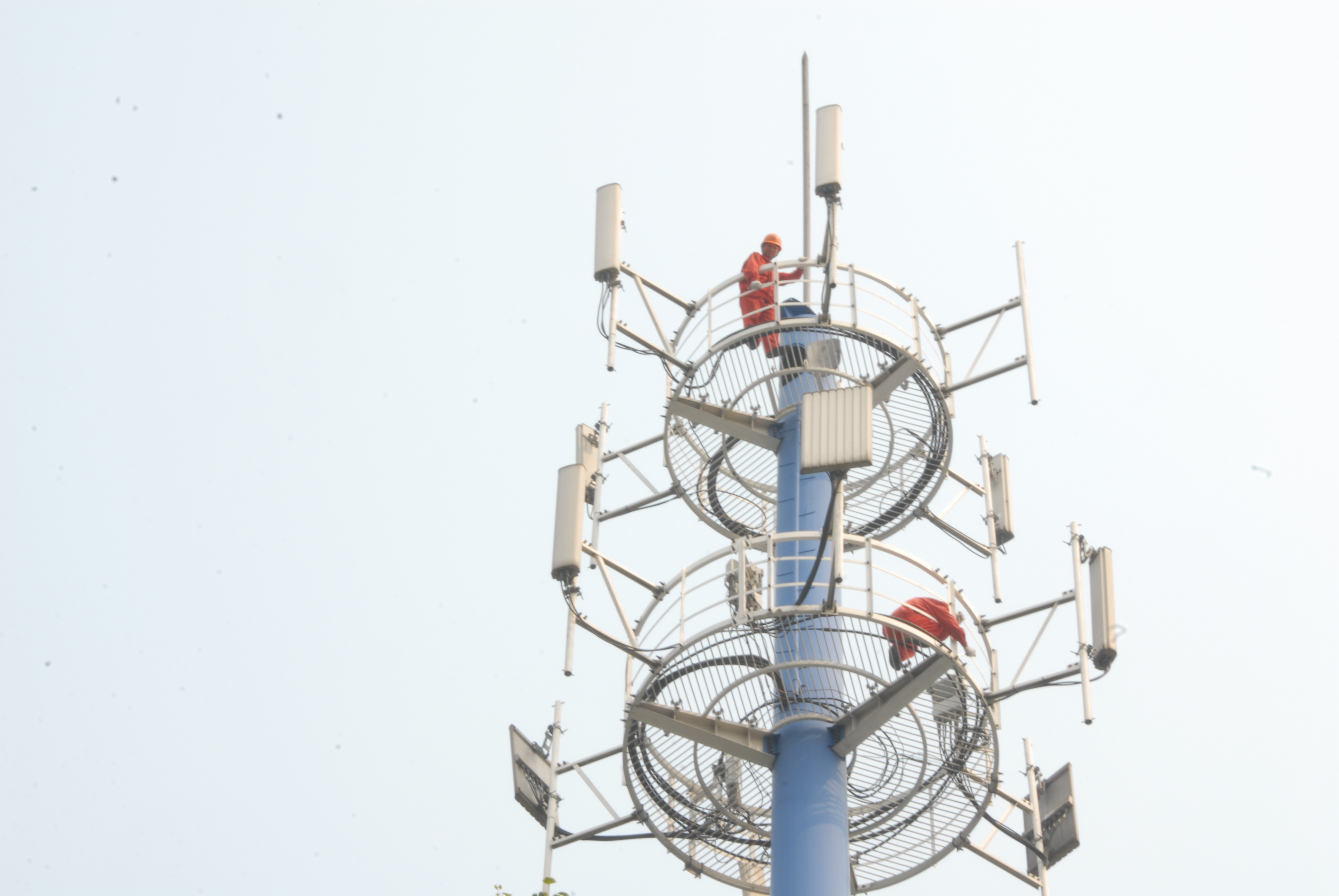 电联巡检维护人员在检查通信基站塔体平台