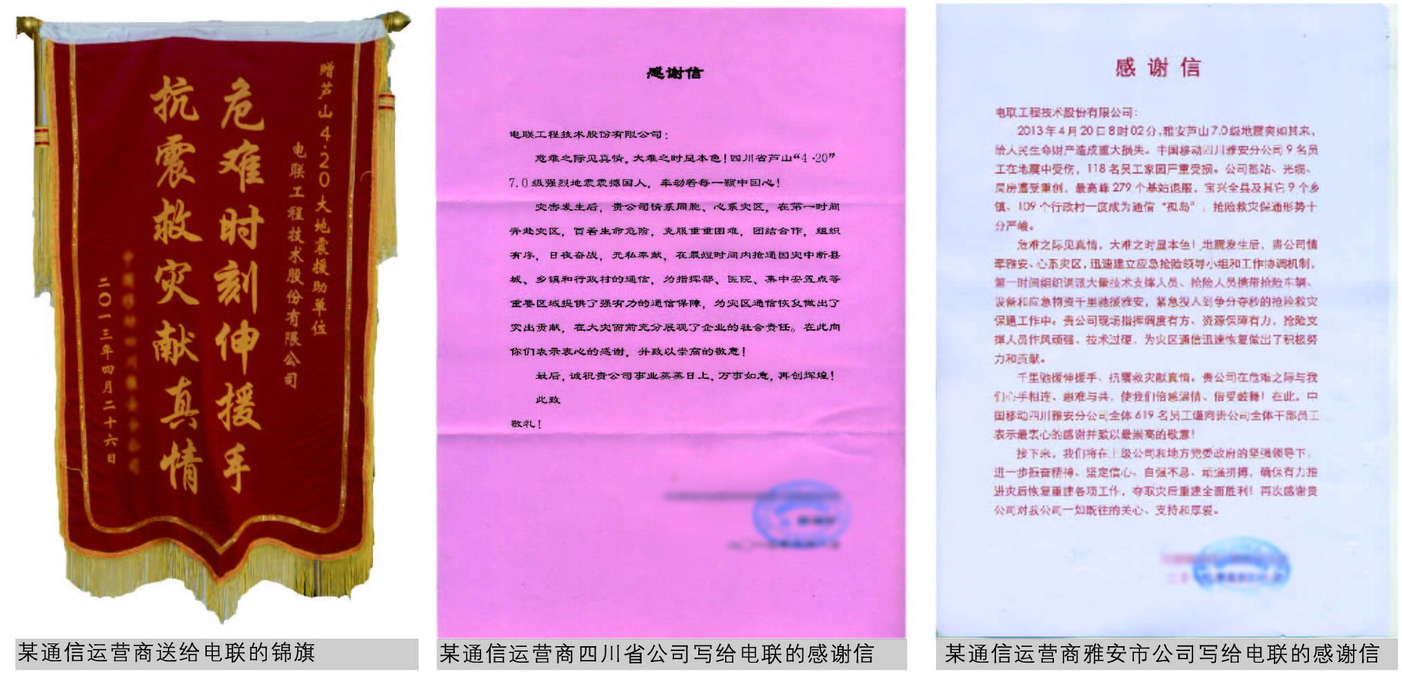 “4•20”庐山地震牵动着全国人民的心,电联在地震发生后第一时间组织全体员工开展“抗震抢险、保障通信”工作;并紧急调派应急抗震救灾抢险队伍和装备,多路并进,克服余震频发、飞石塌方、山路崎岖等艰难险阻,风驰电掣赶赴灾区。在通信运营商的领导下,协助通信运营商开展抗震抢险,保障通信的工作,以协助通信运营商度过难关,协助雅安人民重建家园。于是便有了这封来自灾区的感谢信和锦旗。