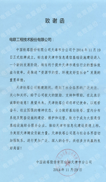 近日,中国铁塔股份有限公司天津市分公司给电联工程技术股份有限公司写来感谢信,感谢电联对天津铁塔公司筹建的大力支持与协助。