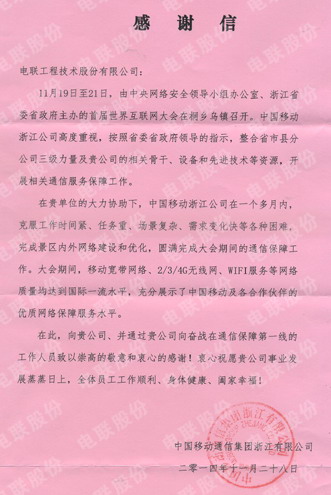 世界互联网大会结束后,业主单位特意发来感谢信,就电联公司优质的网络建设保障服务水平,向电联致谢。“在贵单位的大力支持下,中国移动浙江公司在一个多月内,克服工作时间紧、任务重、场景复杂、需求变化快等各种困难,完成景区内外网络建设和优化,圆满完成大会期间的通信保障工作。大会期间,移动宽带网络、2/3/4G无线网、WIFI服务等网络质量均达到国际一流水平,充分展示了中国移动及各合作伙伴的优质网络保障服务水平。”