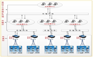 通信塔监测系统采用分层和模块化的设计方式,由传感层、传输层、监控中心和维护终端组成。