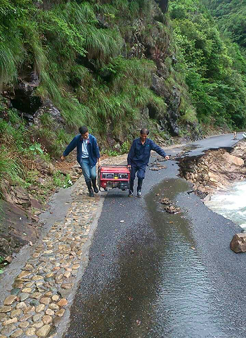 暴雨造成了道路塌方,为了保障通信畅通,电联的一线工作人员就抬着沉重的油机去发电;同时还加强易受灾线路、站点的隐患排查,对部分周边积水较深站点进行设备抬高等处理,保护通信设备。