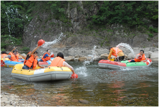 很快地,中心的每一个员工就都穿上了红色的救生衣,拿着木浆,彼此关照着,有序地登上了漂流筏,有些员工还不时调皮地摆摆POSE。随着漂流筏从河坝奔腾入水,尖叫声、欢呼声不断,激流澎湃,体验着速度与激情的畅快。漂流筏在激流中随着水道蜿蜒急进、撞击、逆转、下冲……清凉的溪水劈头盖脸而来,飞珠溅玉。冒险、刺激、惊异、开怀大笑……汇成了欢乐的海洋。