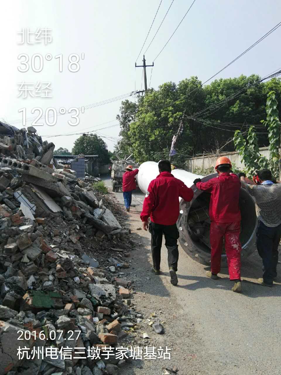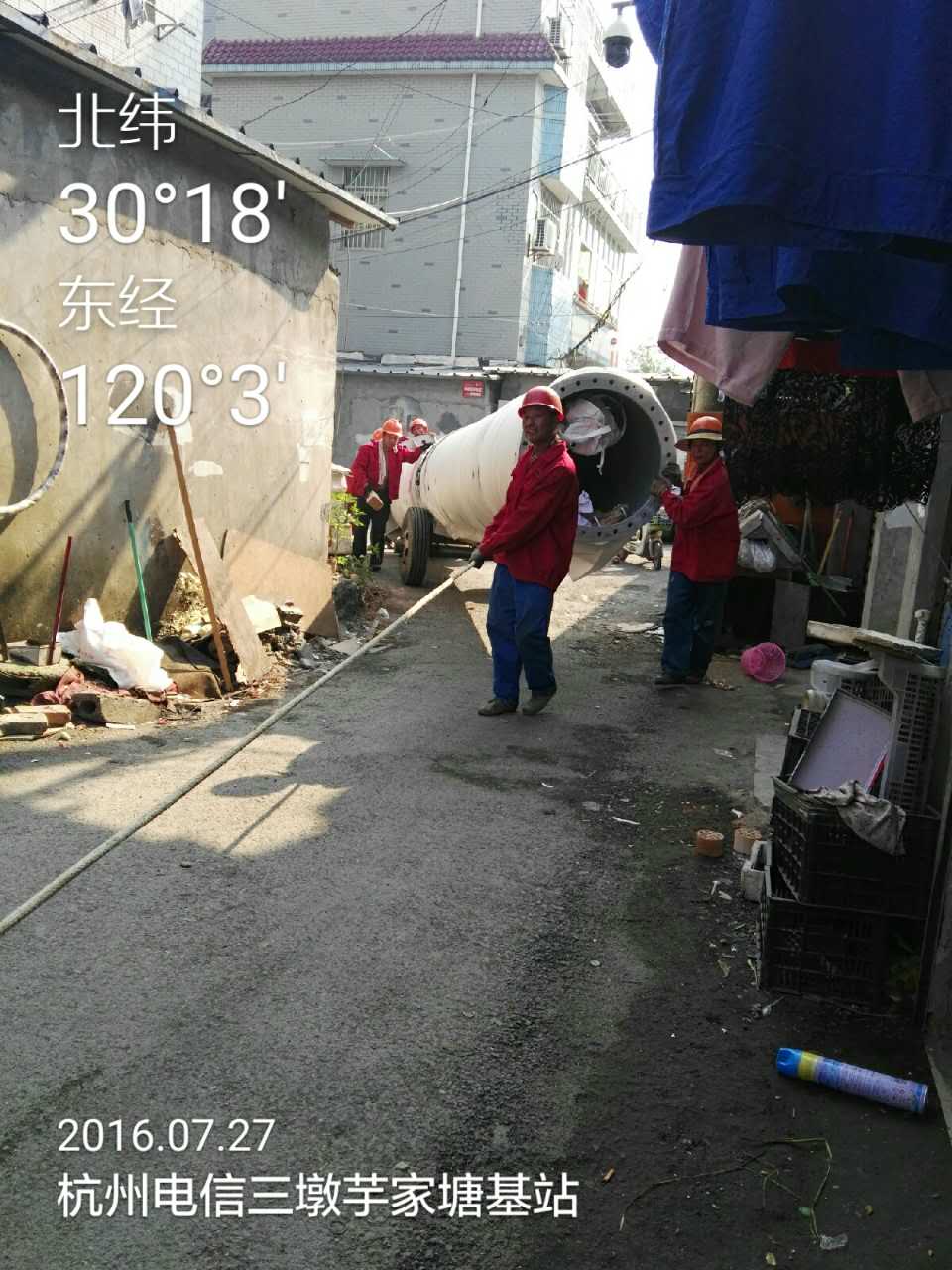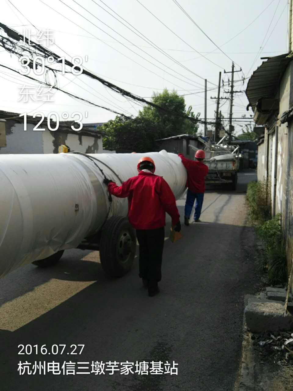 该基站位于杭州市三墩芋家塘村的一个小山坡上,现场运输条件较为艰难,大型车辆无法进入,因此需要进行人工二次搬运上山。工程量大,任务重,时间紧迫,基站需要在月底完成开通。为此,电联安装队加班加点,确保安装任务能顺利完成。