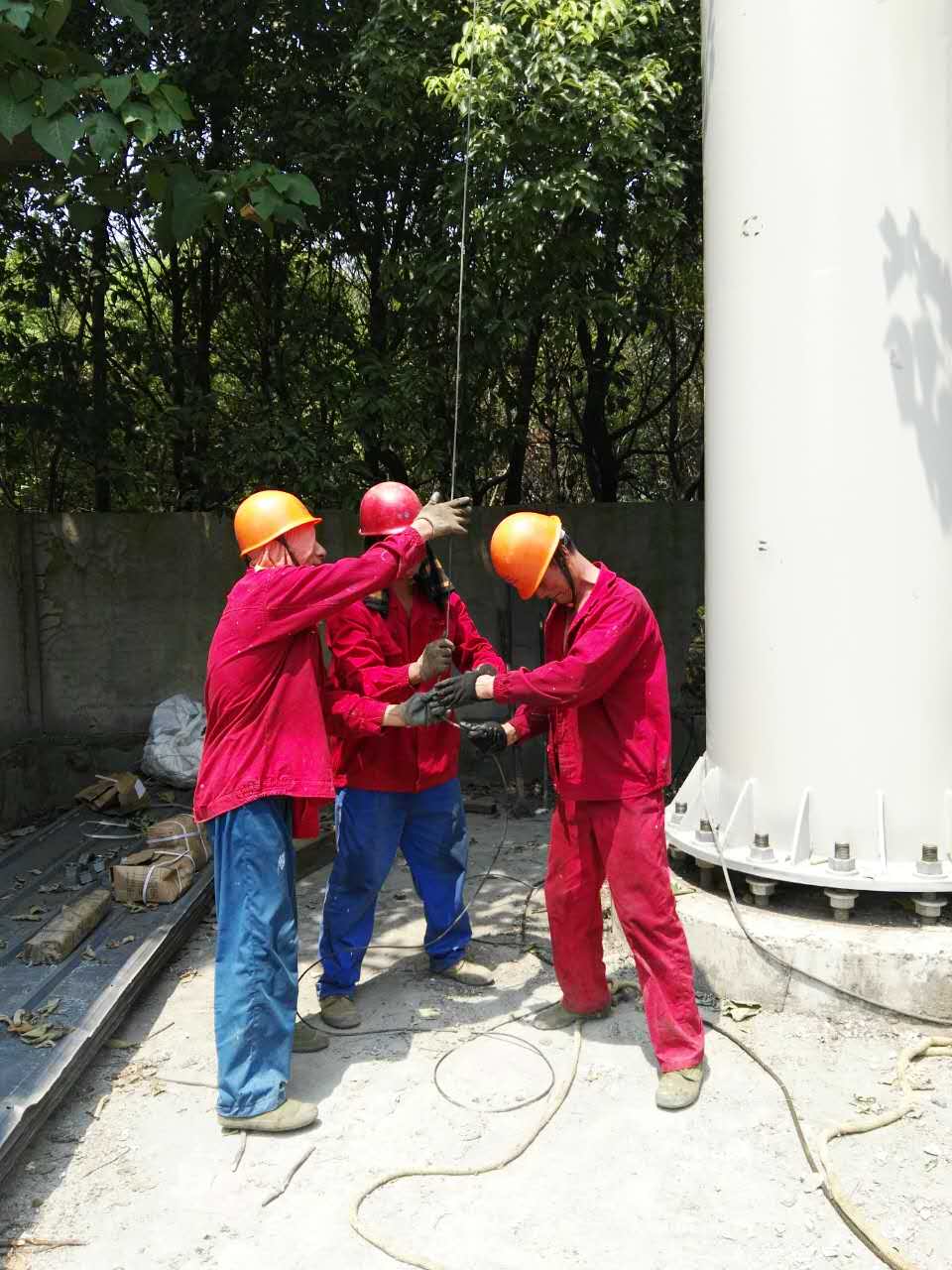 上午时分,温度已经很高,安装现场热浪袭人,已经工作几个小时、体力消耗很大的安装队员开始不住地流汗,厚重的工作服被汗水湿透,贴在身上很不舒服。但安装人员顾不上这些,擦一把汗继续进行塔体安装。
